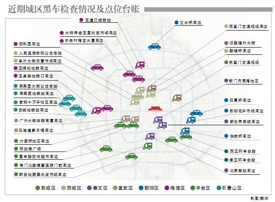 分布在“黑車地圖”上的128個重點地區(qū)中,東城6處、西城10處、崇文8處、宣武15處、朝陽28處、海淀19處、豐臺33處、石景山9處。其中,豐臺、海淀和朝陽三區(qū)的黑車分布點以絕對優(yōu)勢占據(jù)前三甲,總量占到近7成。