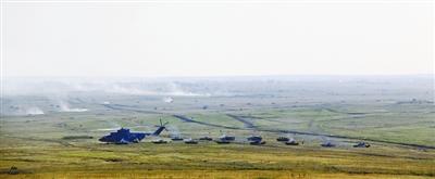 俄米-26直升機(jī)為中俄兩軍步兵戰(zhàn)車(chē)、坦克實(shí)施油料補(bǔ)給。本報(bào)記者 羅錚攝