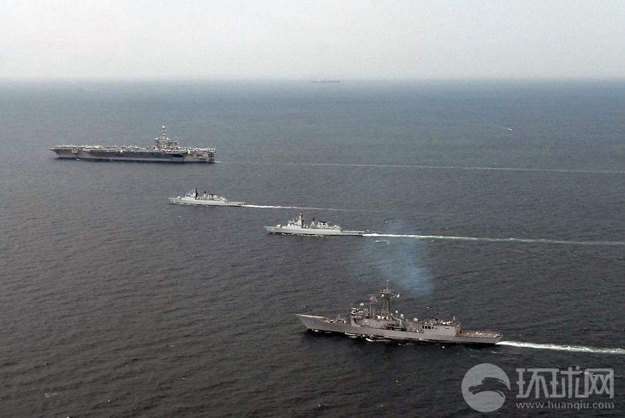 馬來西亞海軍戰(zhàn)艦與美軍華盛頓號航母組成編隊航行