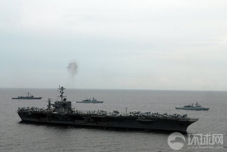 馬來西亞海軍戰(zhàn)艦與美軍華盛頓號航母組成編隊航行
