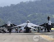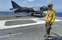 在此次美菲聯(lián)合登陸演習(xí)中,一架AV-8B鷂式戰(zhàn)斗機從好人理查德號兩棲攻擊艦上起飛。