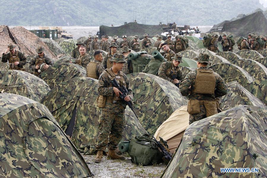 美菲兩棲聯(lián)合軍演第二天,當(dāng)天來自美國(guó)兩極攻擊艦“好人理查德”號(hào)上的約120名美國(guó)海軍陸戰(zhàn)隊(duì)員和約30名菲律賓海軍陸戰(zhàn)隊(duì)員來到了菲律賓塔拉省的烏鴉峽谷,參加直升機(jī)突襲項(xiàng)目的演習(xí)。