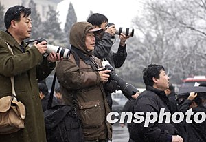 全國人大代表在六日參加十屆全國人大一次會議時(shí)正逢北京雨雪飄飛,在人民大會堂東門等候代表的記者全副武裝。作者:廖文靜