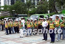澳門十八日舉行由三千人參與“全民清潔日”活動,這是澳門近期以來舉行的最大規(guī)模的全民自覺防病熱潮,圖為民政總署的工作人員整裝待發(fā),準備開赴各街區(qū)進行清潔衛(wèi)生消毒。李剛 攝