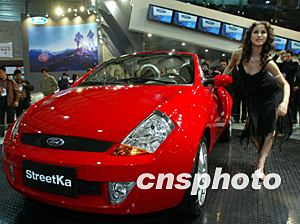 美國福特汽車公司新型跑車在美女的陪伴下十九日亮相即將開幕的第十屆上海國際汽車展覽會(huì)。作者:趙振清