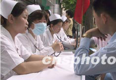 福建省立醫(yī)院護(hù)士,十二日在街頭向市民宣講嚴(yán)防“非典”科普知識。作者:劉可耕