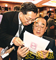 中國衛(wèi)生部常務副部長高強(右)與臺灣當局“疾管局長”蘇益仁在馬來西亞舉行的世衛(wèi)全球SARS研討會上。