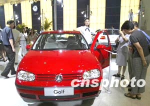 中國一汽-大眾新生產(chǎn)的世界經(jīng)典兩廂高爾夫轎車15日亮相第三屆中國長春汽車博覽會,其發(fā)動機(jī)排量有1.6、1.8、2.0三種,售價(jià)在15萬至18.5萬元人民幣,受到消費(fèi)者的關(guān)注。中新社記者:趙振清