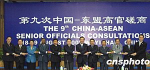“第九次中國(guó)—東盟高官磋商”十八日在福建武夷山舉行。圖為會(huì)前中國(guó)外交部副部長(zhǎng)王毅與東盟十國(guó)高官及東盟秘書(shū)長(zhǎng)牽手合影。作者:吳世宏