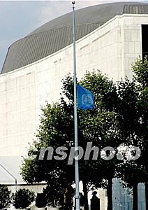 聯(lián)合國駐巴格達(dá)總部大樓十九日遭炸彈襲擊,二十人在爆炸中喪生,紐約聯(lián)合國總部隨即降半旗致哀。中新社記者:趙海燕