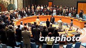 聯合國安理會二十日晚間舉行緊急會議研究有關聯合國設施的安全保障問題,與會的安理會成員國代表在會議中起立默哀,悼念十九日發(fā)生在巴格達的炸彈襲擊事件中的遇難者。中新社記者:趙海燕