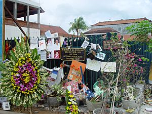據(jù)介紹,巴厘島當(dāng)局原打算在這塊空地上建一座紀(jì)念碑,但因有爭議,被擱置了下來。在街道左邊的小三角形地段,建筑工人正在鋪設(shè)路面。對(duì)面一座新商店已開始營業(yè),臨近的“泛印尼銀行”還修筑了一道新圍墻,樓頂加蓋了藍(lán)瓦新頂。除了這塊尚不知作何用途的空地以外,爆炸案現(xiàn)場已漸漸和庫塔街融為一體。
