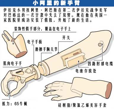中新網(wǎng)10月13日電 據(jù)路透社報(bào)道,英國(guó)一家報(bào)紙星期一報(bào)道說(shuō),在伊拉克戰(zhàn)爭(zhēng)中失去雙臂和大部分家人的伊拉克男童已成功地安裝上了人造假肢。
