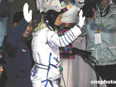 五時(shí)二十八分,循著這有些激動(dòng)的聲音,只見(jiàn)身著乳白色航天服的首飛航天員楊利偉邁著從容而穩(wěn)健的步伐,從問(wèn)天閣航天員的專(zhuān)用通道,微笑著向大家走來(lái)。緊隨他身后的是身著天藍(lán)色訓(xùn)練服的航天員翟志剛和聶海勝。隨著歡快的《迎賓曲》奏起,航天員們被掌聲和鮮花包圍著。