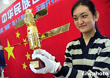 十月十六日清晨,中國首次載人航天飛行獲得圓滿成功,一位姑娘手捧剛剛買到的24K鍍金“神舟”五號載人飛船模型,激動(dòng)地在北京王府井向路人展示。中新社記者:張勤