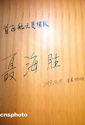 二00三年十月十五日凌晨,中國(guó)飛天第一人楊利偉及首飛梯隊(duì)航天員于“神舟”五號(hào)載人飛船發(fā)射前,在酒泉衛(wèi)星發(fā)射中心航天員公寓“問(wèn)天閣”的住房房門上簽名留念。中新社記者 孫自法 攝影報(bào)道
