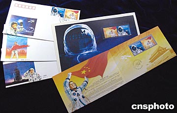 10月16日,北京市郵票公司配合國家郵政局發(fā)行《中國首次載人航天飛行成功》郵票1套2枚,特設(shè)計(jì)印制了《中國首次載人航天飛行成功》首日封(1套3枚、左)、郵折(右)、郵票大卡(中)等郵品,與郵票同時(shí)發(fā)行。中新社記者:鄒憲