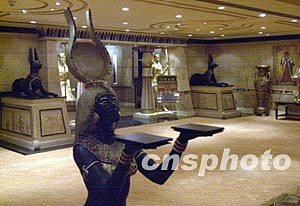 五個(gè)貴賓廳總體風(fēng)格設(shè)計(jì)是位于置地三樓的法老王宮殿?yuàn)蕵?lè)場(chǎng)的延伸,但又各有特色!翱ㄩT(mén)皇殿”以埃及最富盛名的年輕法老圖坦卡門(mén)的皇殿為主題;“佩德拉皇殿”以埃及著名的皇后佩德拉其中一個(gè)私人行宮為主題;“大衛(wèi)皇殿”以大衛(wèi)王的私人居室為主題,表現(xiàn)非洲和阿拉伯的情調(diào);“所羅門(mén)皇殿”就以羅馬帝國(guó)經(jīng)典神殿為主題;“海神皇殿”表現(xiàn)羅馬神話(huà)中海神休閑的海底世界。每一貴賓廳的色調(diào)、燈光、壁畫(huà)、雕塑都予人出神入化的神秘感覺(jué),令人仿如置身神話(huà)宮殿。