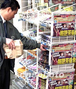 藝人梅艷芳因子宮頸癌導(dǎo)致肺功能失調(diào),于十二月三十日凌晨二時五十分在香港病逝,香港部份媒體連夜趕工再版,刊登最新消息,致使三十日報紙有不同版本。圖為清晨香港報攤加緊整理報紙以饗讀者。中新社記者:錢興強(qiáng)