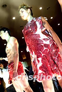 二十九日晚在北京舉行的NE.TIGER時尚峰會上,模特展示一款別開生面的“牛肉裝”,設計者將牛肉演化為天然面料,制成薄薄的長裙,使動物的物質本身創(chuàng)造性地體現(xiàn)了人的奇異視覺美感。中新社記者:毛建軍