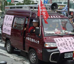 游行自下午1時(shí)許開(kāi)始,參加民眾分乘160多輛汽車,車上插著旗幟、貼著標(biāo)語(yǔ),上書(shū)“愛(ài)中華,反‘臺(tái)獨(dú)’,反戰(zhàn)爭(zhēng),要和平”、“拒領(lǐng)公投票,否決違法公投”等字樣。車隊(duì)從中華路與成都路交界處出發(fā),浩浩蕩蕩穿行臺(tái)北市區(qū)主要街道,最后匯集到臺(tái)灣當(dāng)局領(lǐng)導(dǎo)人的辦公場(chǎng)所前。游行民眾在這里高喊口號(hào),書(shū)寫(xiě)標(biāo)語(yǔ),表示抗議。