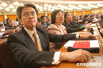 來(lái)自香港的全國(guó)政協(xié)委員馮華健在全國(guó)政協(xié)十屆二次會(huì)議的閉幕會(huì)上按表決器,表決各項(xiàng)決議。中新社記者:史利