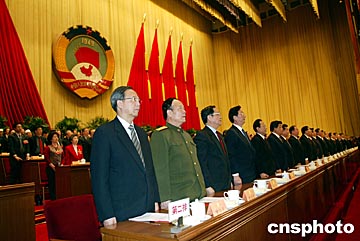 全國(guó)政協(xié)十屆二次會(huì)議十二日在北京人民大會(huì)堂閉幕,在主席臺(tái)就座的人員全體起立唱國(guó)歌。中新社記者:滿(mǎn)會(huì)喬