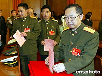 十屆全國(guó)人大二次會(huì)議三月十四日在北京人民大會(huì)堂舉行閉幕式,解放軍人大代表投票表決“憲法修正案草案”。中新社記者:毛建軍
