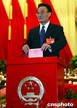 十屆全國人大二次會(huì)議三月十四日在北京人民大會(huì)堂舉行閉幕式,全國人大常委會(huì)委員長吳邦國投票表決“憲法修正案草案”。中新社記者:毛建軍