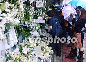 四月一日是一代歌星張國榮逝世一周年忌日,香港及海外眾多歌迷手捧鮮花冒雨來到文華酒店前,以不同方式表達(dá)對歌星張國榮的深切懷念。中新社記者:錢興強