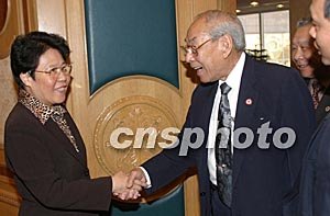 四月二日,中國國務院僑辦主任陳玉杰(左)在北京新世紀飯店會見來華的美國安良工商會訪問團全體成員。中新社記者:史利