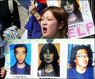 數(shù)百日本民眾在外相官邸集會(huì),要求日本政府從伊拉克撤軍,以解救三名被綁架的人質(zhì)。