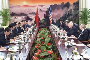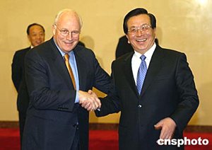 中國國家副主席曾慶紅四月十三日在北京人民大會(huì)堂與來訪的美國副總統(tǒng)切尼舉行會(huì)談。中新社記者:毛建軍