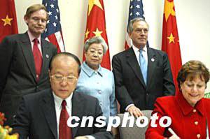 四月二十一日在美國(guó)華盛頓舉行的第十五屆中美商貿(mào)聯(lián)委會(huì)上,中國(guó)國(guó)務(wù)院副總理吳儀告訴美國(guó)人:中美經(jīng)貿(mào)并非此消彼長(zhǎng),而是互利雙贏。圖為吳儀與美國(guó)商務(wù)部部長(zhǎng)埃文斯共同會(huì)見(jiàn)記者。作者:余東暉