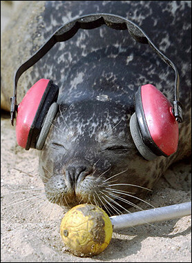 一個(gè)正在接受科學(xué)研究的14歲海豹頭戴耳機(jī),樣子憨態(tài)可掬。