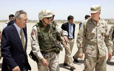 中新網(wǎng)5月13日電 美國(guó)國(guó)防部長(zhǎng)拉姆斯菲爾德和美國(guó)參聯(lián)會(huì)主席邁爾斯13日抵達(dá)巴格達(dá),對(duì)伊拉克展開“閃電式”訪問。