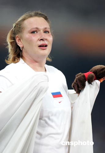 當?shù)貢r間八月二十一日晚,在雅典奧運女子鐵餅比賽中,俄羅斯名將薩多娃第五投擲出了六十七米零二的成績,不但摘走金牌,也擊碎了希臘人科列西多的奪冠夢想。中新社記者:毛建軍