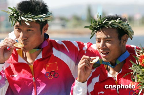 當地時間八月二十八日,中國選手孟關良、楊文軍在雅典奧運男子五百米雙人劃艇比賽中奪得金牌。中新社記者:毛建軍