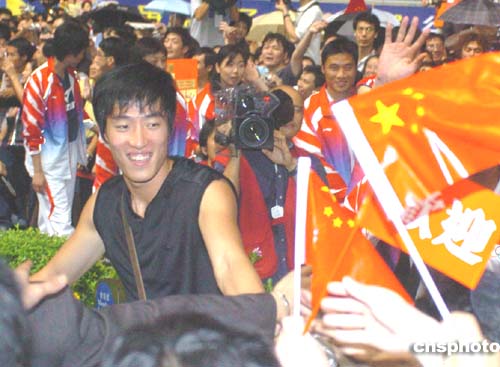 國家奧運金牌運動員代表團9月8日晚在香港跑馬地馬場參觀,“欄王”劉翔所到之處均受到熱烈歡迎。作者:趙振清
