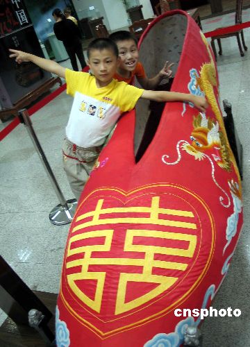 | 江蘇鎮(zhèn)江市的兩名兒童與一只世界最大的繡花鞋合影。據(jù)介紹,這只在當(dāng)?shù)厣虡I(yè)城展出的繡花鞋全長(zhǎng)2.8米,寬0.87米,高0.71米,重達(dá)63公斤,鞋內(nèi)可躺臥兩至三人,是由溫州7名著名手工藝專(zhuān)家用半年多時(shí)間精心制作而成,共耗去1公斤多真絲彩線(xiàn),五匹布,及100多公斤有關(guān)材料。鞋面繡有大大的雙喜字、兩側(cè)繡有龍鳳圖案,繡面光亮,紋理分明,色彩鮮艷。作者:陳崗