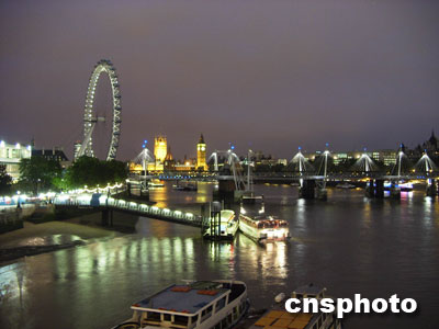 倫敦泰晤士河夜景。圖左環(huán)形物為大型觀光摩天輪“倫敦眼”,前方拉索橋?yàn)榧o(jì)念英女王伊莉莎白二世就位半世紀(jì)的“黃金五十周年”大橋,遠(yuǎn)處矗立的尖頂建筑為大本鐘。余瑞冬 攝