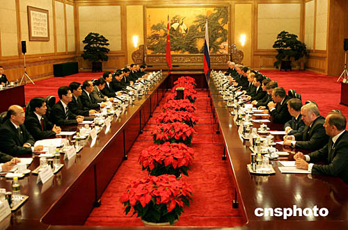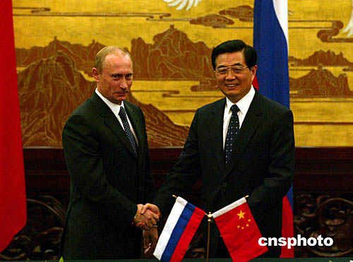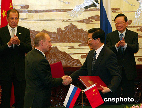 普京完全贊同胡錦濤的看法和建議,他說,發(fā)展俄中合作是俄一貫政策!抖碇心类徲押煤献鳁l約》為兩國(guó)關(guān)系發(fā)展奠定了重要基礎(chǔ),雙方解決邊境問題、就俄加入世貿(mào)組織達(dá)成協(xié)議是兩國(guó)戰(zhàn)略協(xié)作伙伴關(guān)系的體現(xiàn)。我們?cè)概c中方切實(shí)落實(shí)該條約的實(shí)施綱要,推動(dòng)雙方在各領(lǐng)域的合作。俄方希望加強(qiáng)經(jīng)貿(mào)合作,爭(zhēng)取在數(shù)量和質(zhì)量上均不斷提高。他重申,俄方關(guān)于同中國(guó)的能源合作的決定始終未變,也愿同中國(guó)加強(qiáng)在科技、人文等領(lǐng)域的合作。