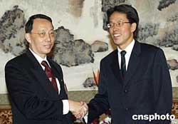 十月二十一日,國(guó)務(wù)院港澳辦副主任張曉明(右)在北京國(guó)賓館會(huì)見了由陳景生率領(lǐng)的香港大律師工會(huì)訪華團(tuán)。作者:史利