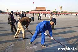 10月23日,清潔工人正在北京天安門廣場對已經(jīng)發(fā)黑的花崗巖地面進行清洗。清洗工作完成后,廣場地面將恢復(fù)淡粉色原貌。清洗工作原計劃在十天內(nèi)完成,但由于污漬太多,加上清理口香糖等污漬難度大,估計此次廣場大“洗臉”將會延期完成。作者:張煒