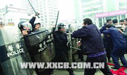 20余人聚集在某市市政府前“鬧事”,110民警迅速趕到現(xiàn)場設(shè)立警戒線,阻止“鬧事者”的前進。但情緒激動的“鬧事者”很快便沖破了第一道防線,開始毆打民警。接報趕到的防暴大隊特警手持防暴盾牌進行攔截,設(shè)置了第二道防線。為了迅速平息大規(guī)模的“騷亂事件”,上級命令使用催淚彈等對“鬧事人群”進行驅(qū)散。幾顆催淚彈丟在地上,散出滾滾濃煙。當(dāng)特警采取防暴隊形圍捕了為首的“鬧事者”后,其余人便立即作鳥獸散去,“危機”終于化解。