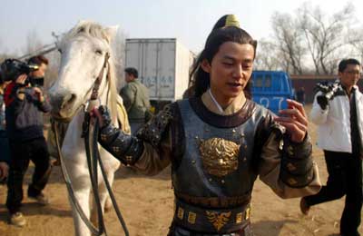 當然最讓何炅開心的是,他克服了從小落下的陰影學會了騎馬,“我小時候在動物園曾被馬踢過,所以一直對馬有一種陰影,但是在這次的戲中和我配合的這匹馬與我特別有緣,它很健壯,并且還很會搶鏡,讓我也出盡了風頭。”看得出來何炅非常喜歡他的這匹愛馬,在采訪的同時他就不停地和馬交流撫摩好像好朋友一樣,他還騎上馬跑了一圈向大家展示了一番。
