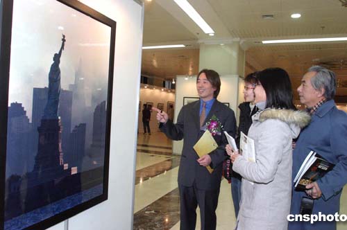 美國華裔攝影家施頌輝九·一一攝影作品展十二月一日開始在北京首都圖書館展出。一百幅攝影作品記錄了世貿(mào)原址從九·一一事件發(fā)生后第二天的救援行動直到一年后移走最后一根鋼梁的珍貴歷史鏡頭。圖為施頌輝(左一)向觀眾介紹攝影作品。作者:張勤