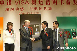 十二月八日,中國銀行聯(lián)手Visa國際組織,在北京發(fā)行全球首張以二零零八年奧運(yùn)會為主題的“中銀VISA奧運(yùn)信用卡”。中新社記者:廖文靜