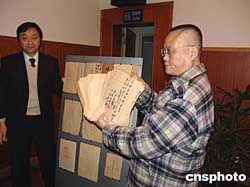 十三日下午,專程從臺灣趕來的原南京審判日本戰(zhàn)犯軍事法庭審判長石美瑜遺孀石沈和玉攜子石南陽,向侵華日軍南京大屠殺遇難同胞紀念館捐贈了南京審判日本戰(zhàn)犯軍事法庭的起訴書、判決書、會議記錄、詢問記錄、照片、書籍等一百一十七件珍貴史料。圖為捐贈現(xiàn)場。作者:王曉紅