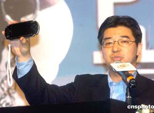 2004年亞洲游戲展17日在香港會展中心開幕﹐日本索尼計算機娛樂PSP業(yè)務(wù)籌備室主任茶谷公之先生在開幕式上展示手提游戲機。作者:趙振清
